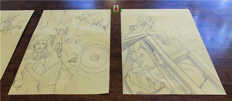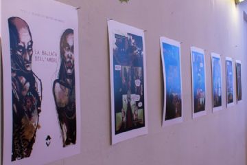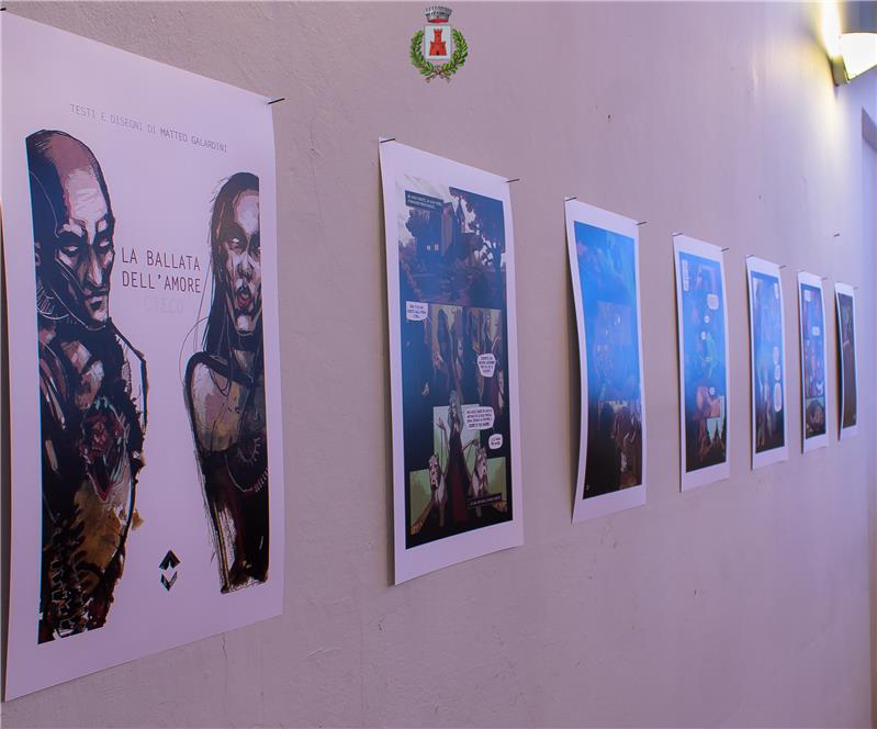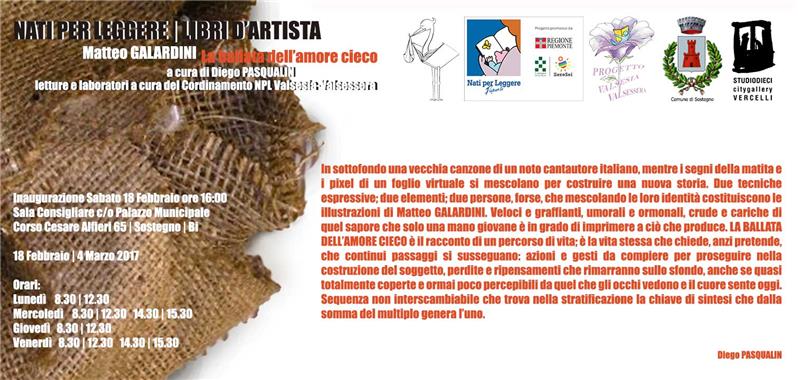 In sottofondo una vecchia canzone di un noto cantautore italiano, mentre i segni della matita e i pixel di un foglio virtuale si mescolano per costruire una nuova storia. Due tecniche espressive; due elementi; due persone, forse, che mescolando le loro identità costituiscono le illustrazioni di Matteo GALARDINI. Veloci e graffianti, umorali e ormonali, crude e cariche di quel sapore che solo una mano giovane è in grado di imprimere a ció che produce. LA BALLATA DELL’AMORE CIECO è il racconto di un percorso di vita; è la vita stessa che chiede, anzi pretende, che continui passaggi si susseguano: azioni e gesti da compiere per proseguire nella costruzione del soggetto, perdite e ripensamenti che rimarranno sullo sfondo, anche se quasi totalmente coperte e ormai poco percepibili da quel che gli occhi vedono e il cuore sente oggi. Sequenza non interscambiabile che trova nella stratificazione la chiave di sintesi che dalla somma del multiplo genera l’uno. Diego Pasqualin IN MOSTRA dalle ore 16:00 di sabato 18 Febbraio 2017 fino al 4 Marzo 2017 (negli orari di apertura al pubblico del Municipio) PRESSO LA SALA CONSILIARE del Municipio di Sostegno in Corso Cesare Alfieri 65.